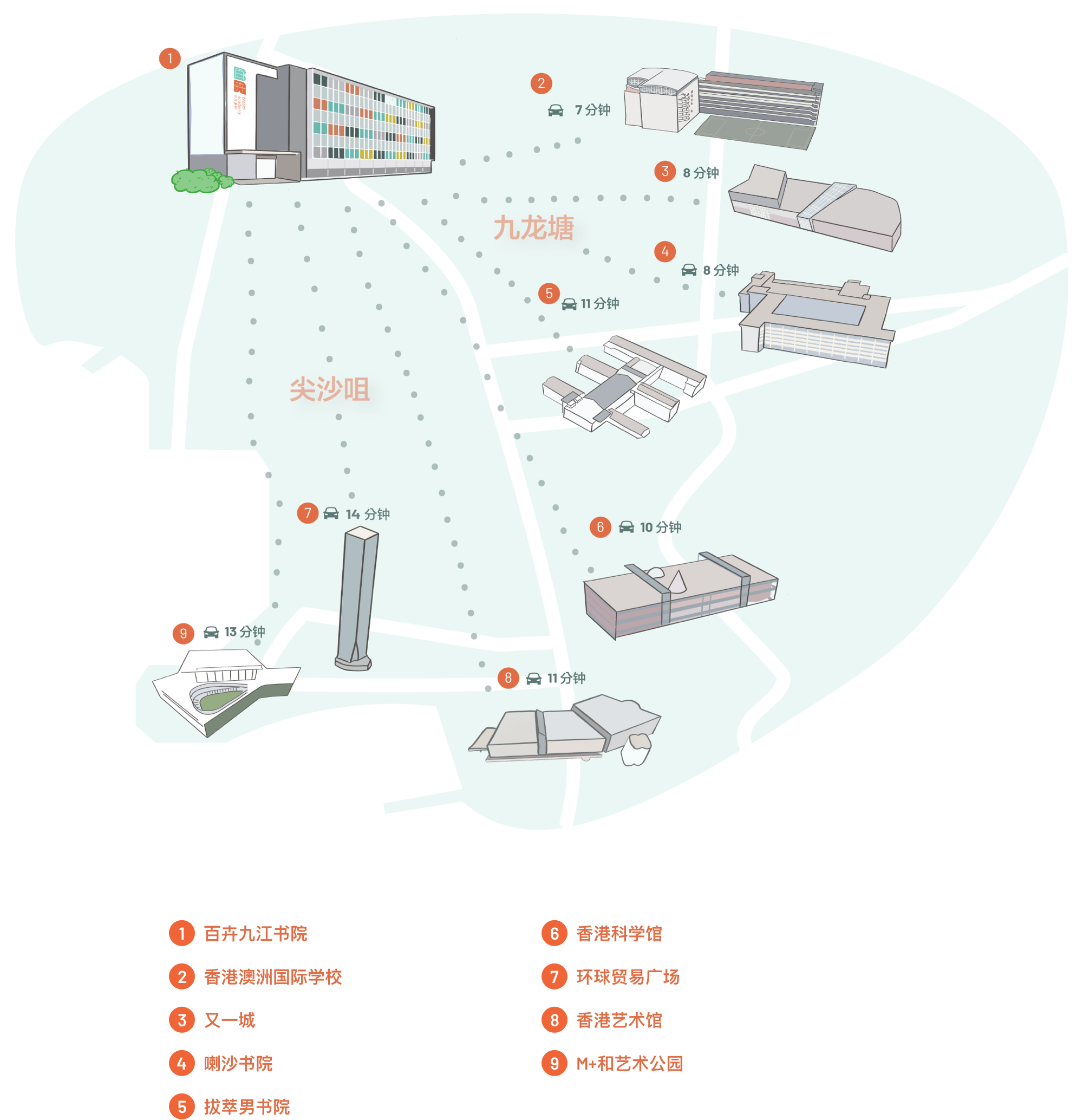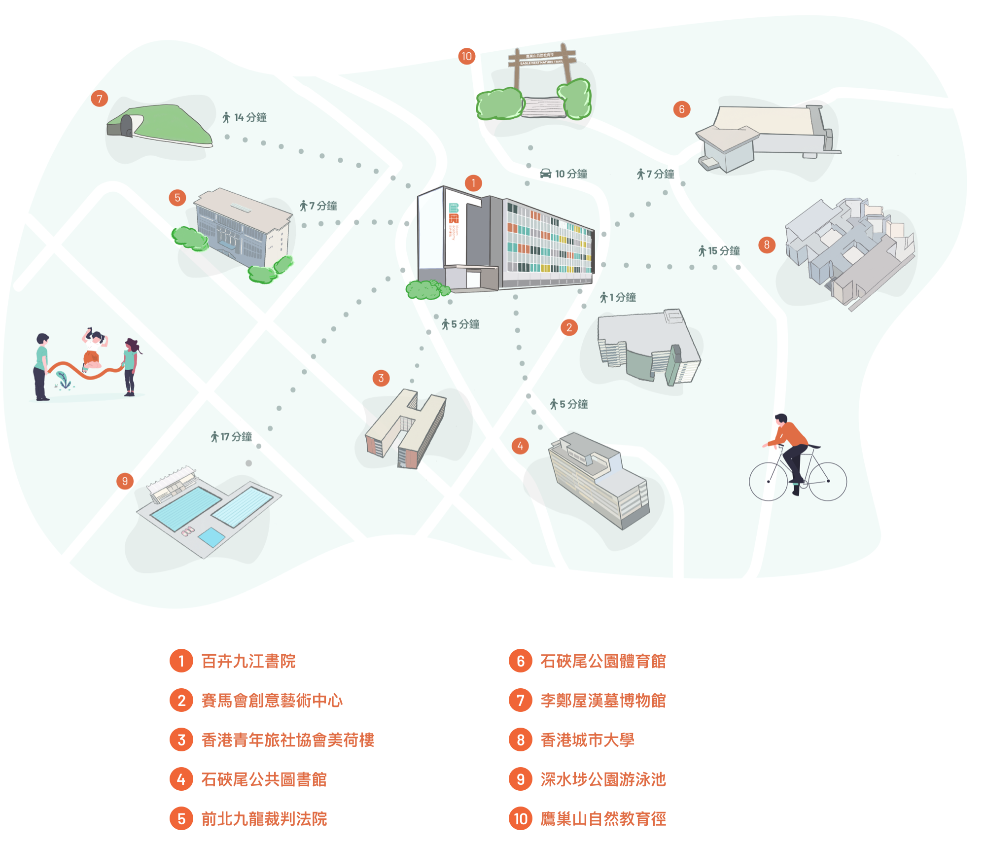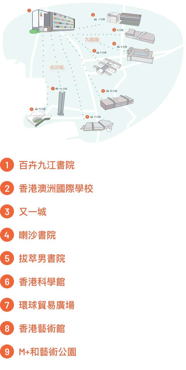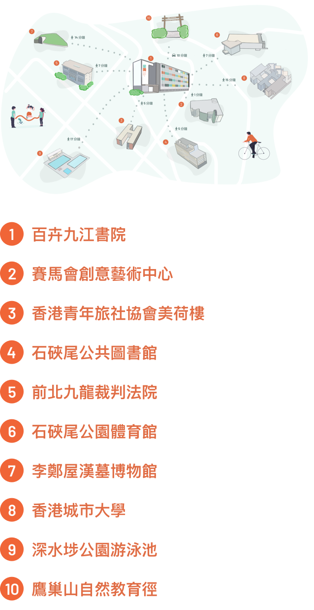 百卉九江書院以所身處的社區自豪。這裏是設計和文化產業興旺之地,有助改善教學和擴闊學生視野。百卉的創新教育規劃,鼓勵動手創作;校舍近水樓台,接近深水埗眾多銷售布料、時尚配飾、機械零件和美術用品的商店。這一區有許許多多設計師、工匠和藝術家,還有各式各樣的文物商店和古董寶藏。學校對面就是賽馬會創意藝術中心,那是一個跨媒體文化表演場地,為創作者提供價格相宜的藝術工作室和展覧設施,如黑盒劇場等。由陶瓷店、影樓、水墨畫廊到住好啲香港街頭文化館,百卉所毗鄰的社區提供豐富機會,使學生能親承創意人材和藝術家教誨。從學校步行至美荷樓博物館或前北九龍裁判法院,觀賞或參加有關香港歷史和發展之展覽和活動,亦只需五至七分鐘。